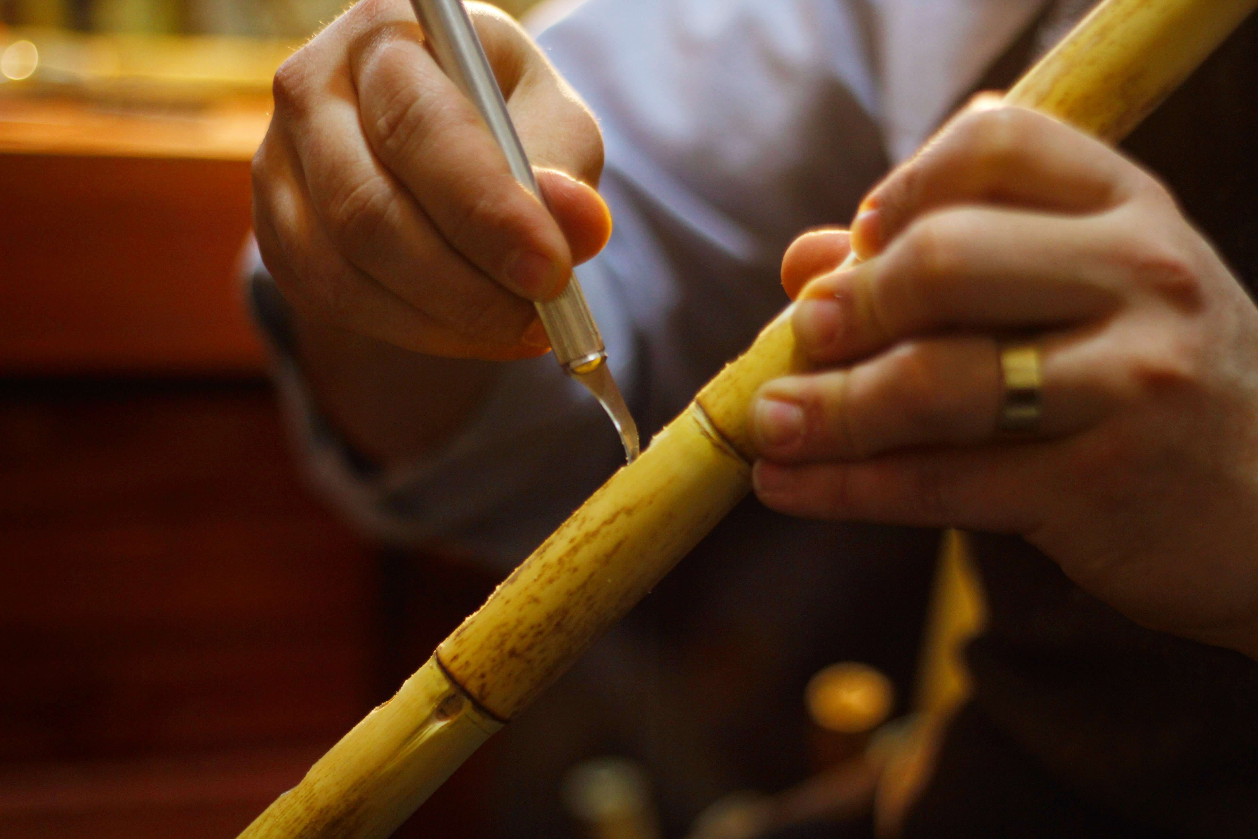 The dried reed is purified from its leaves and the areas curved by heat to be straightened.